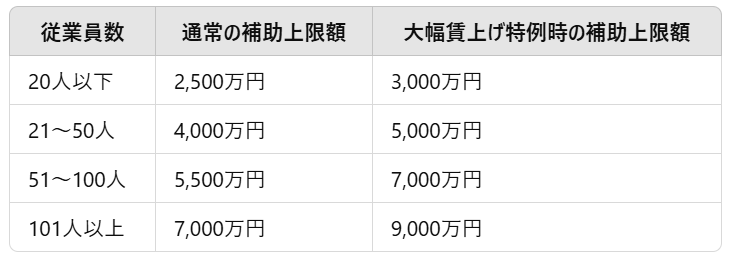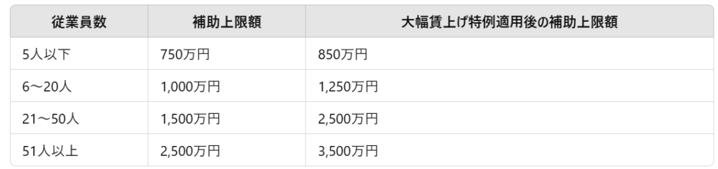 - 補助上限額: 従業員数に応じて以下の通りです。