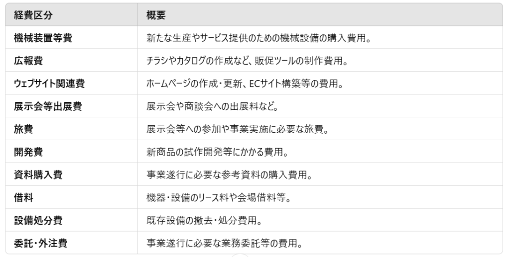 - 補助対象経費: 建物費、構築物費、機械装置・システム構築費、技術導入費、外注費、広告宣伝・販売促進費などが含まれます。