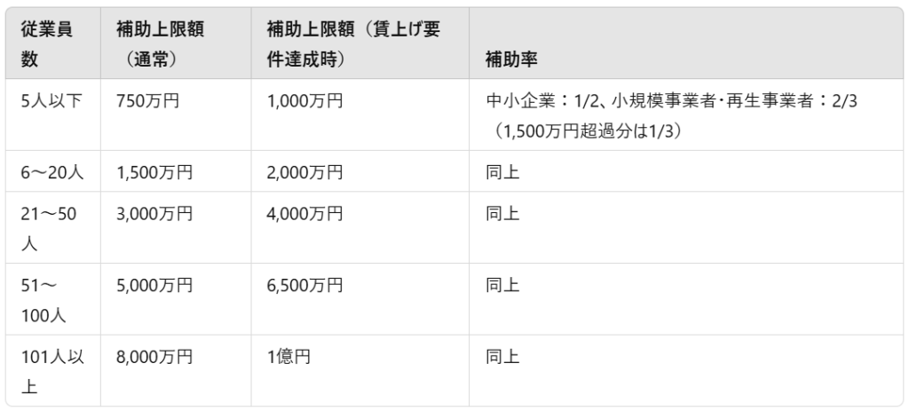 一般型の補助上限額と補助率は、従業員数に応じて以下のように設定されています。
